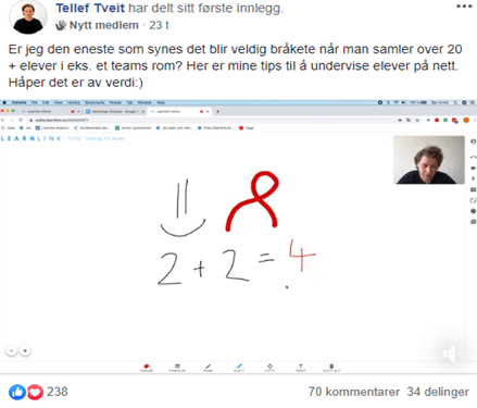 Den nye, isolerte hjemmehverdagen gir oss nye utfordringer. Som i sin tur skaper grobunn for nye og kreative løsninger på nett. For på nettet trenger vi slett ikke isolere oss, tvert i mot samhandles det på tvers i en grad som får en HR-hippe til å bli blank i øynene Det tenkes nytt og kreativt for å finne løsninger i vår nye hverdag. Det dannes grupper og etableres nye nettverk. Spesielt er jeg imponert over alt som skjer i gruppen Korona-dugnad for digitale lærere. I skrivende stund er 45 000 medlemmer i denne gruppen, og tallet er raskt voksende. Kommunikasjonen deles nå opp i åtte undergrupper som dekker alt fra barneskole til universitet slik at informasjonen blir mer relevant for den enkelte lærer. Gruppene flommer over av iderikdom og løsningsorientering. Lærere hjelper hverandre for å skape gode undervisningsløsninger for elevene. Skole-Norge går sammen for å bestå syretesten for digitalisering av undervisningen.